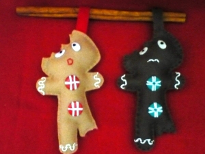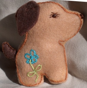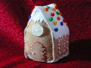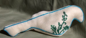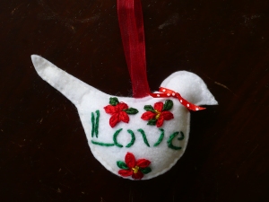These use a pattern from Sew Pretty Christmas Homestyle and are made of felt with embroidery. I used stencils for the words ‘Joy’ and ‘Love’ and hand embroidered flowers using a variety of stitches – satin, oyster, stem, french knot, etc. I used a stamp pad with sand colored ink to make the white birds a bit antique-looking.